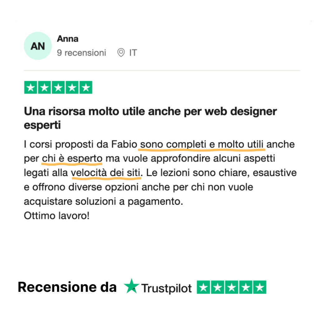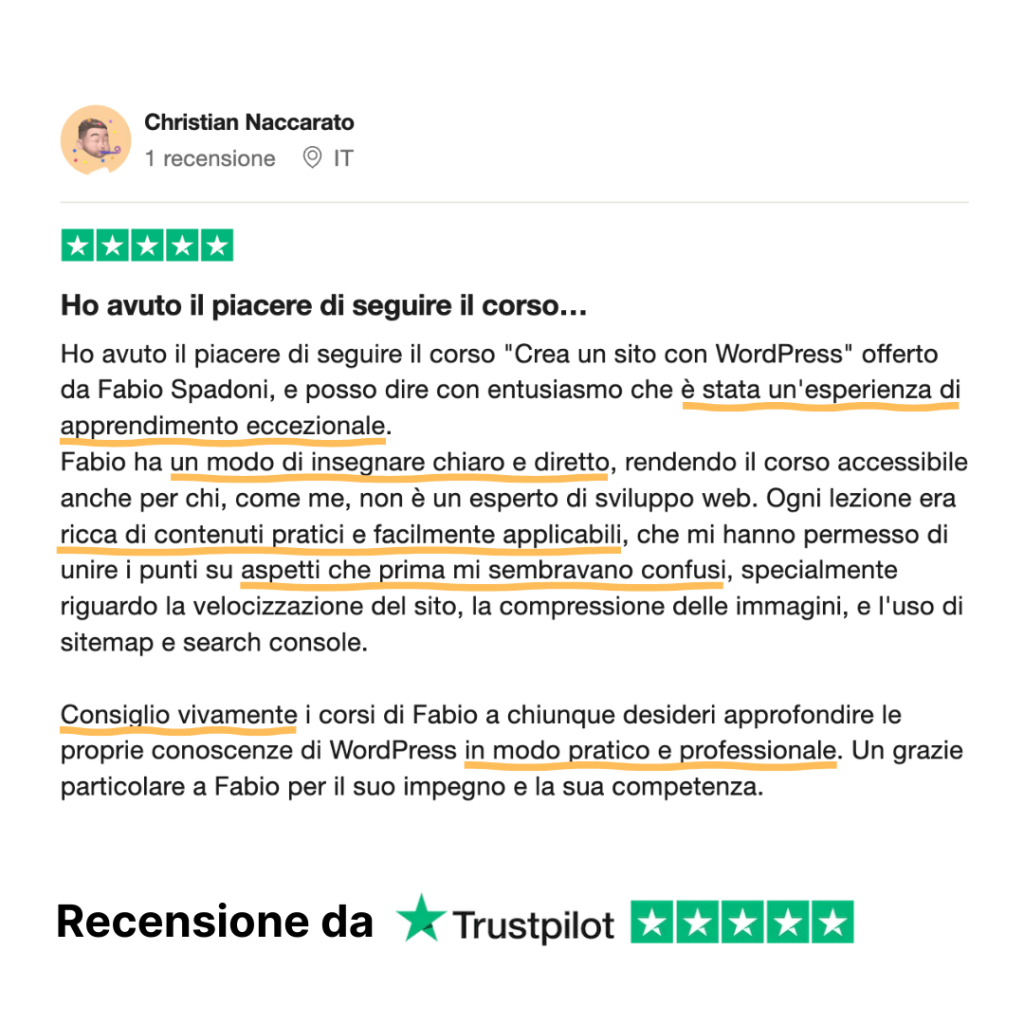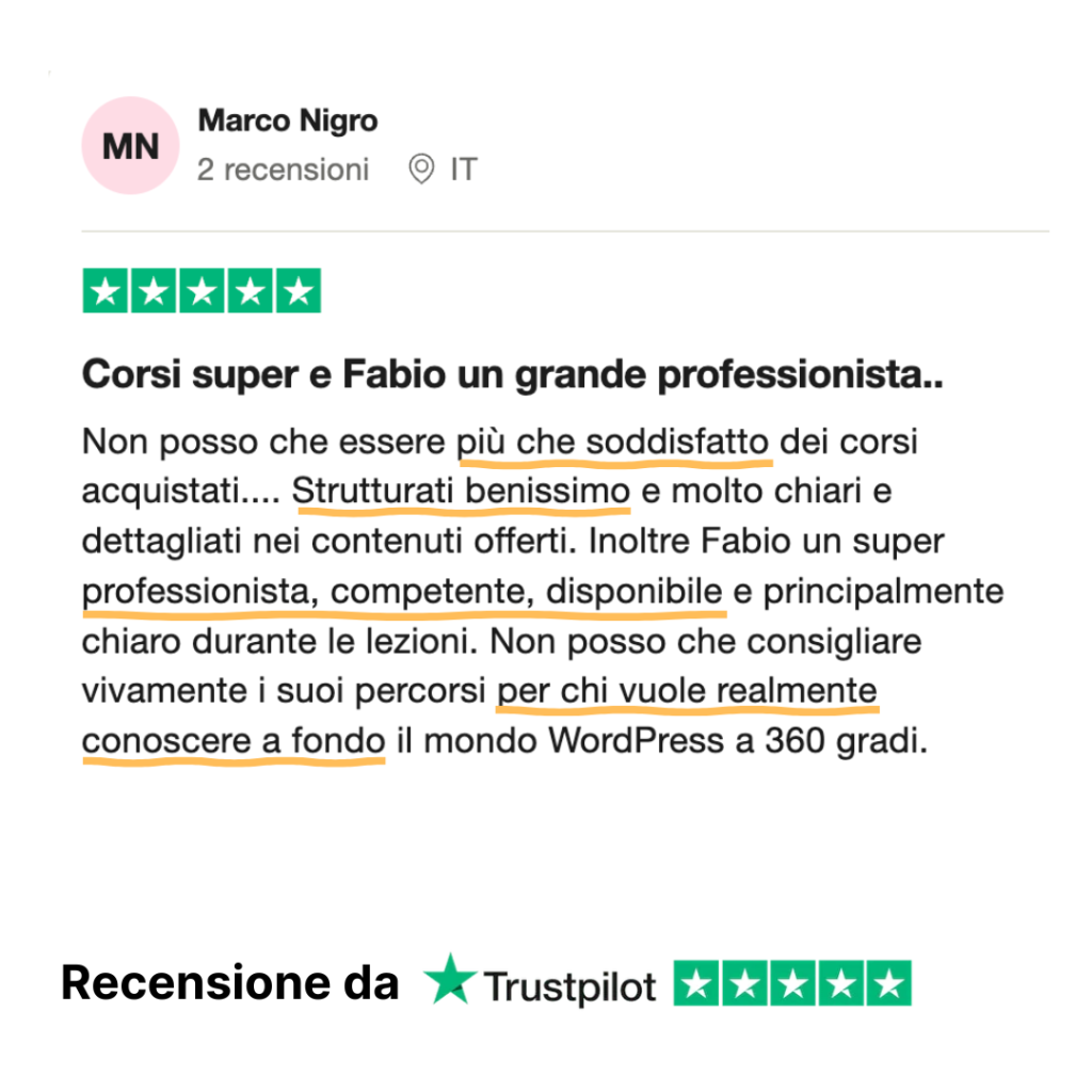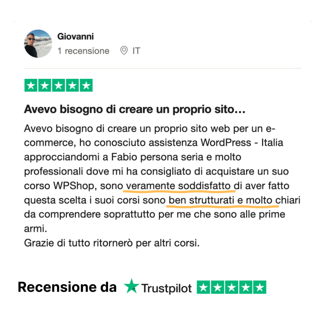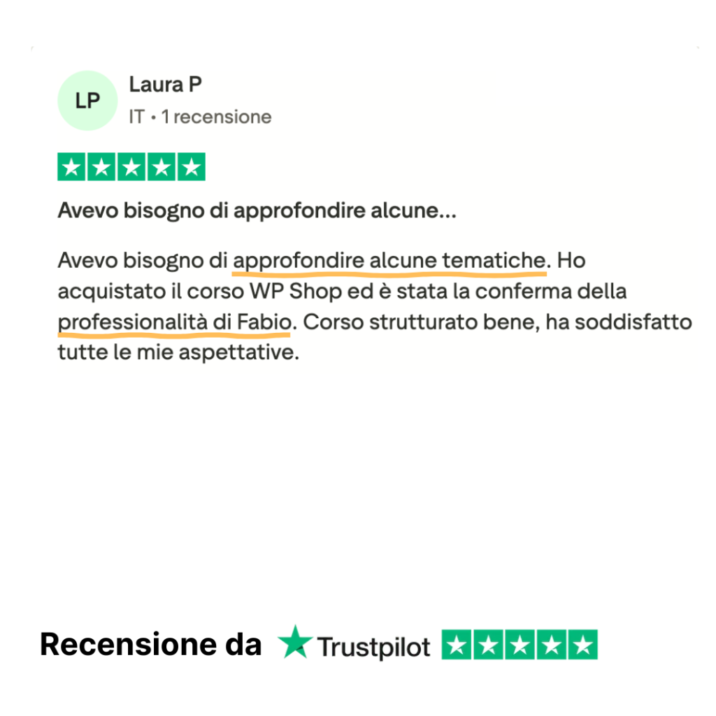 Ho acquistato sia il corso WP Speed che il corso WP Shop. Soddisfatta per entrambi, soprattutto per quello dedicato all’e-commerce. Fabio scende nel dettaglio e ti guida nella creazione del sito dalla A alla Z. Inoltre é disponibile a risponderti per qualsiasi dubbio. Direi rapporto qualità prezzo eccellente.