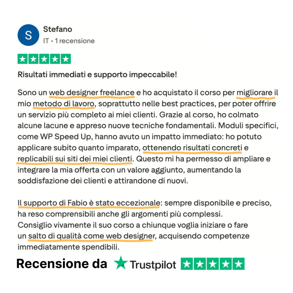 Sono un Wed Designer, freelance, e ho acquistato il corso Wpshop e WpSpeedUp per migliorare come professionista ed esperto. I corsi sono stati veramente utili, esaustivi completi di tutto. Da lì ho sviluppato progetti sempre più importanti e performanti. Il supporto di Fabio è eccellente: ha risposto ad ogni mia domanda in modo semplice ed esaustivo.